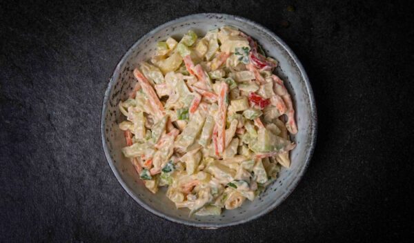 Salade uit eigen keuken: Pasta, bleekseldery, wortel en lente ui.